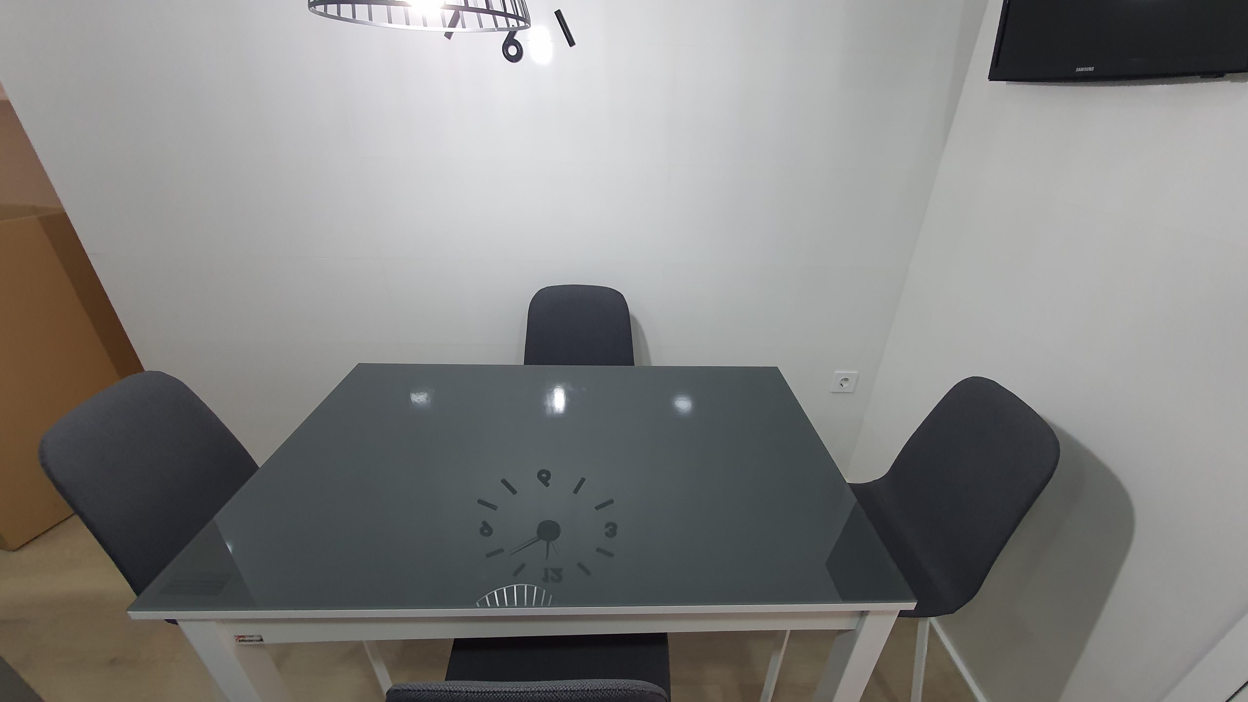 Descripción de la mesa de cristal color cemento estructura aluminio blanco.